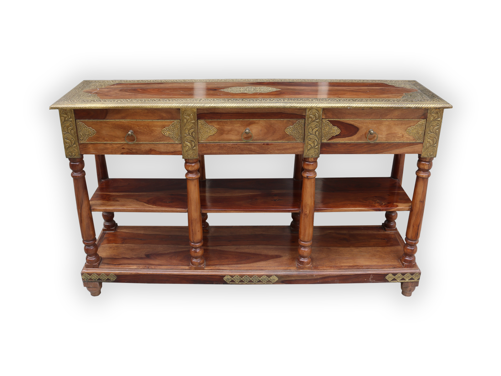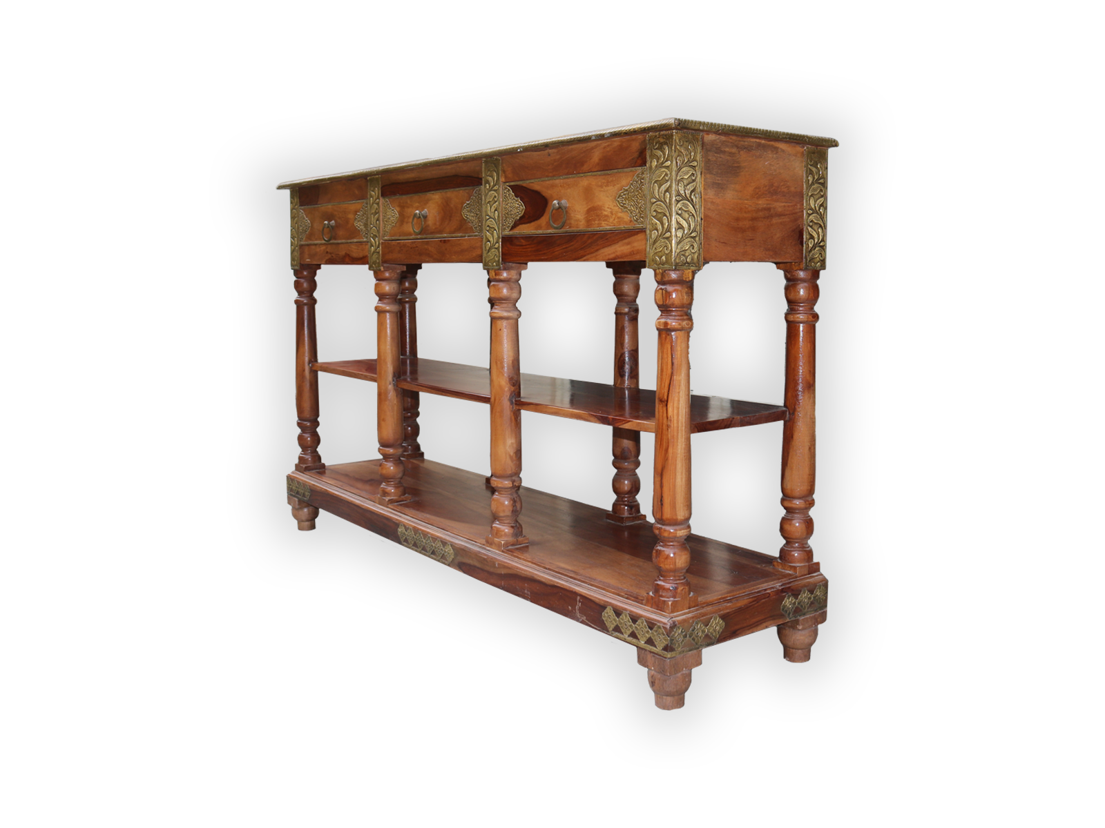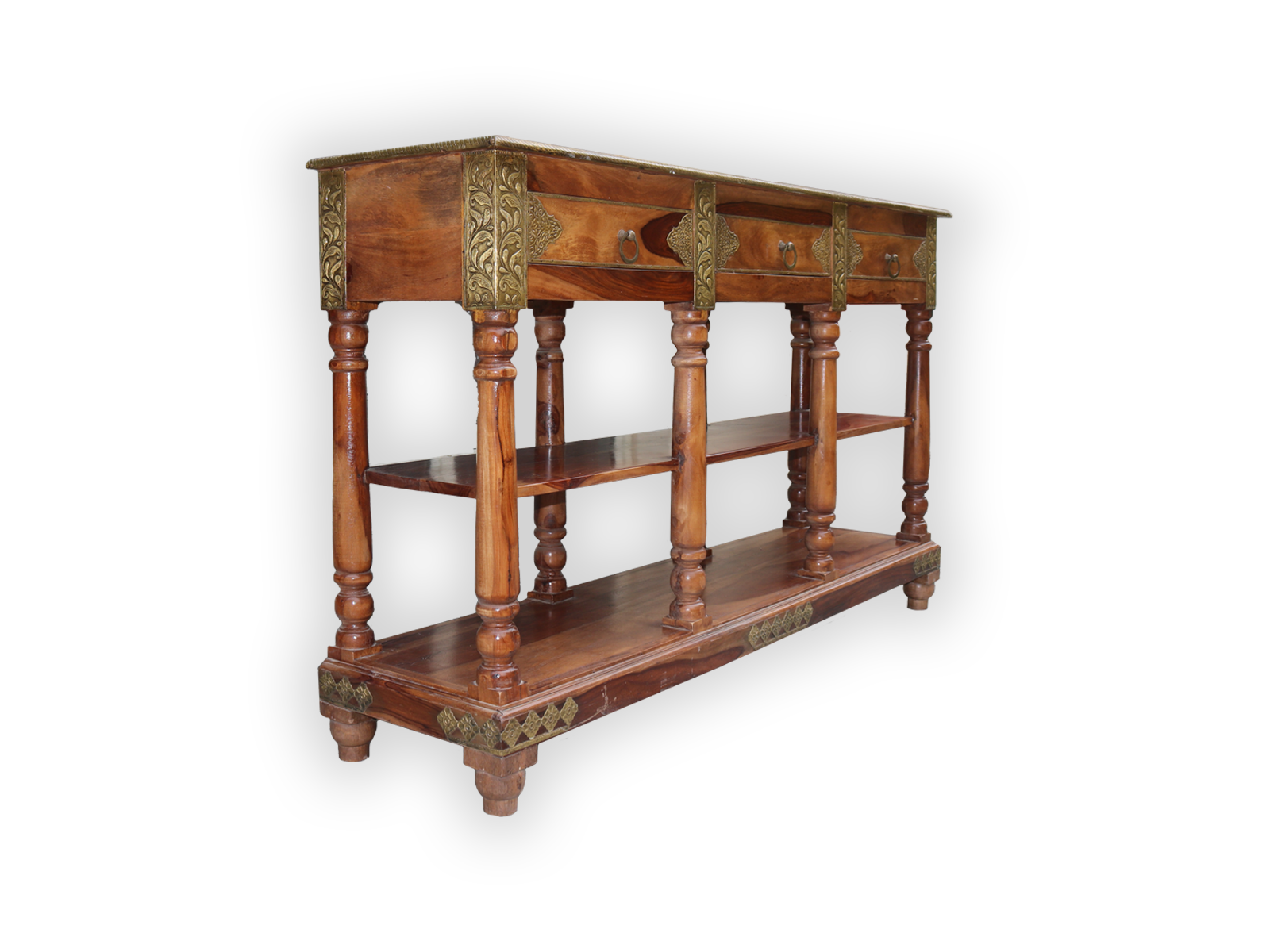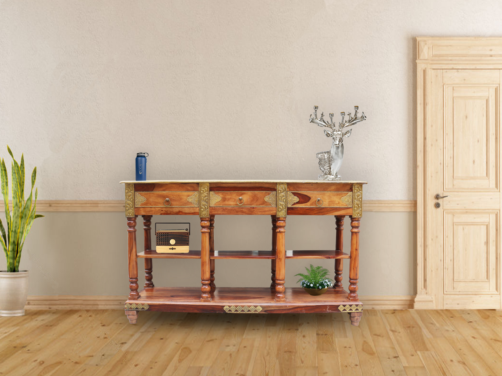 A Sheesham wood brass-fitted console table sounds like a beautiful and elegant piece of furniture. Here are some things to consider and appreciate about this type of table: Sheesham, also known as Indian Rosewood, is known for its durability and rich, warm tones. Look for a table made from solid Sheesham wood to ensure longevity and sturdiness. Brass accents can add a touch of sophistication and a bit of old-world charm. Check the quality of the brass fittings—ensure they are well-finished and securely attached.