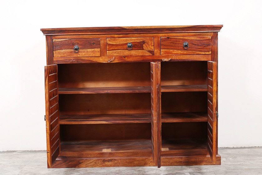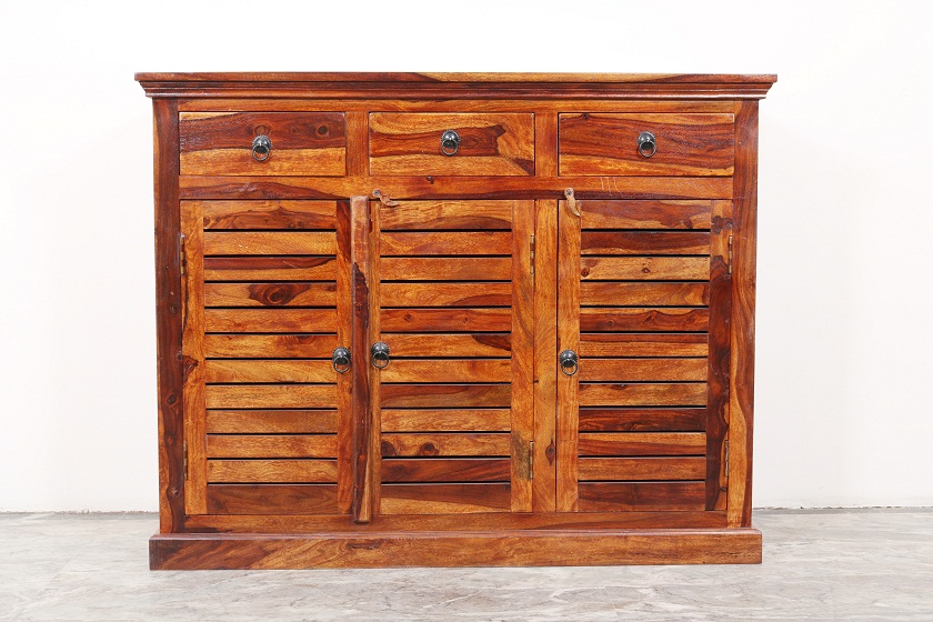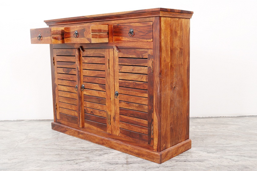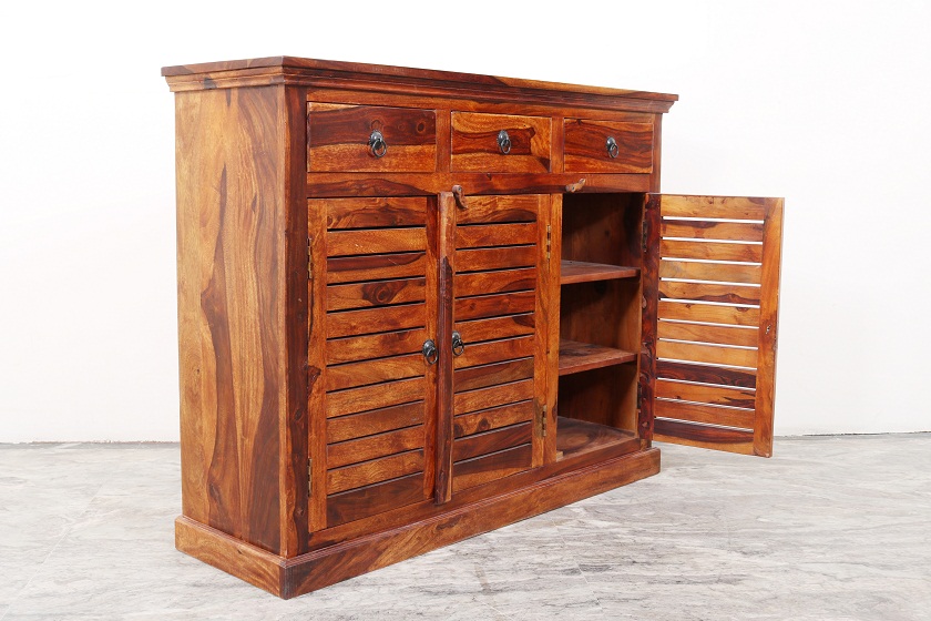 Sleek and Modern design for your home. Shows the grains and grace of the wood. It’s an art of Indian handicraft made in Sheesham wood. There is a royal and contemporary touch to the design. More Storage Capacity with 6 Shelves, 3 Droz and 3 Doors.